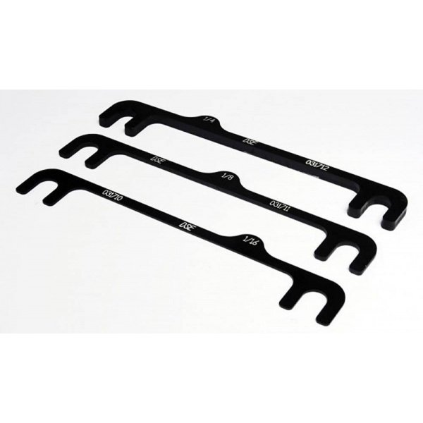 Machined From 6061 Aluminum 4) 1/16 Shims 4) 1/8 Shims 2) 1/4 Shims Anodized Black Detroit Speed's Camber Shim Track Kit allows you to adjust camber easily with our one-piece slotted camber shims. Each shim is machined from 6061 aluminum and is then anodized black for durability. The track kit includes four 1/16 shims, four 1/8 shims, and two 1/4 shims to fit your driving needs.