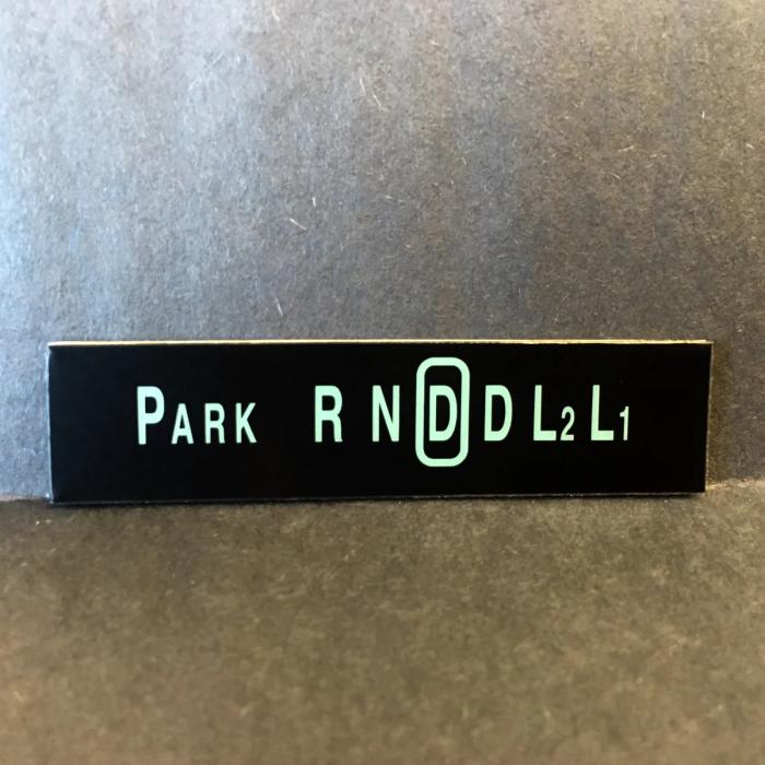 Column lens for 3-speed or 4-speed overdrive automatics. Lens is black plastic with green lettering and is applied over existing indicator.