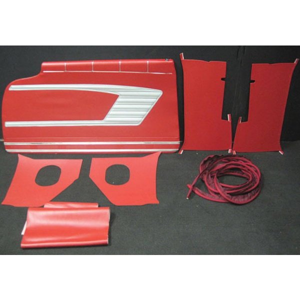 1959 El Camino is a beautiful American automotive classic. The El Camino Store offers these high quality, Door Panels, Assembled, for your restoration project or part replacement. These high quality door panels are preassembled using new waterproof die cut panels and galvanized door edge bands with nails attached. Correct Seville grain vinyls in two colors with the center Herringbone Scallop design inserts. 3 Upper Mylar stripes on the top and heat sealed lower line design with mylar horizontal strips. Window felts and lock knob ferrules attached. Included are vinyl covered front kick panels, 8 yards of cloth windlace and extra Seville vinyl for front armrests. Do not settle for second rate parts for your 1959 El Camino, use only the best for your prized ride. Trust The El Camino Store for all your part needs.