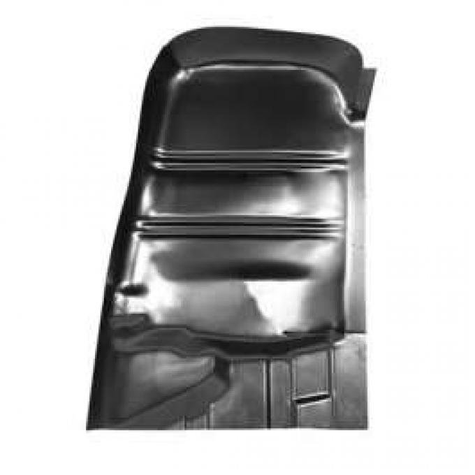 Reproduction Of Original Front Floor Pan 16-1/2 Wide At Front 30 Long 21-1/2 Wide At Rear Right (Passenger's Side) Note: Measurements may vary slightly. Measurement are given as a guideline only. Never cut out your original panels before receiving replacements. The El Camino Store stamped steel sheet metal floor pan repair panels are crucial when rust rears its ugly head. 1973, 1974, 1975, 1976, or 1977 El Camino floor pans take a beating over the years and are rarely rust-free. The El Camino Store sources sheet metal floor pans from the world?s premium manufacturers to bring you only the very best for your El Camino restoration. Floor pans are stamped on heavy ton equipment from correct gauge steel to ensure factory style contours and maximum rigidity over originals. This right side partial front floor pan reaches from the footwell toe panel to the rear edge of the front seat. The floor pans from The El Camino Store must be welded in and usually fitted, so never cut out your original floor pans before receiving replacements. We highly recommend the use of a skilled body shop when installing replacement El Camino floor pans and to always check other related items such as floor braces, rocker panels, toe panels and seat supports for other potential replacement needs. We have sold thousands of sheet metal floor pans and will stand by each purchase to make sure that your El Camino is restored to perfection. From racers, hot rods or daily drivers, trust The El Camino Store for all of your restoration and replacement needs for your 1973, 1974, 1975, 1976, or 1977 El Camino!