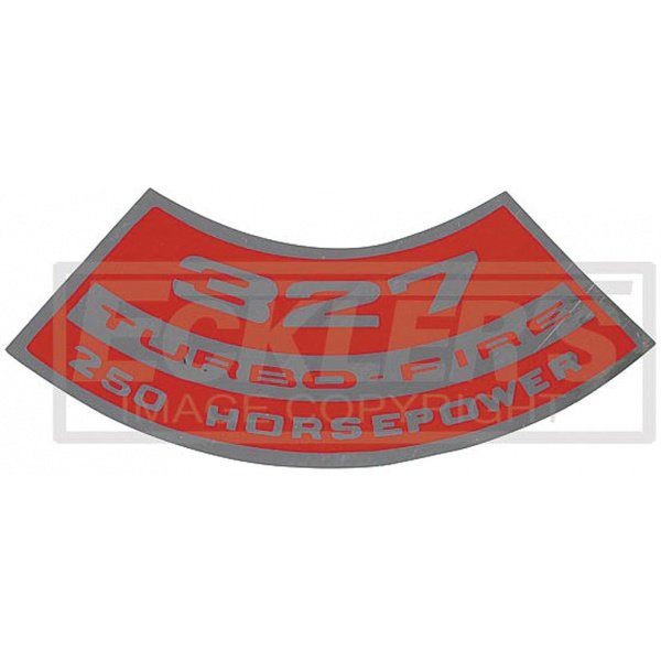 Reproduction Of Original Correct Small Block 327, 250 Horsepower Air Cleaner Decal This El Camino reproduction air cleaner decal has been manufactured to original factory specifications using today's modern manufacturing techniques. You will find the fit and finish will work superbly for your restoration. In addition, using a reproduction air cleaner decal from the El Camino Store will add authenticity and value to your vehicle.