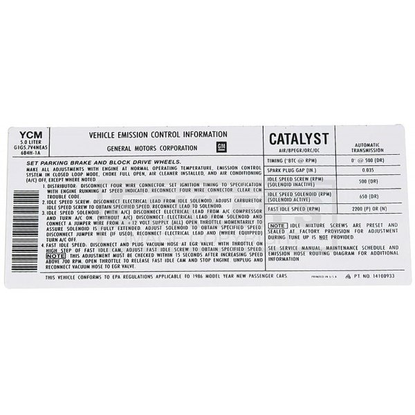 Reproduction Of Original Replaces 5.0 (305) Decal Emissions Decals Can Vary, To Verify You Are Ordering The Proper Decal You Must Match The Emissions Code Located On The Corner Of Your Original. This Is A Reproduction US-YCM Good Condition Decal Required In Some States To Pass Emissions Testing 1986 El Camino & GMC Caballeros sold in California and New York came factory with certain smog requirements including a visible emissions decal under the hood. Many states now have adopted California and New York standards above Federal standards setting the bar that much higher requiring in many cases clear display of these labels and decals. All 1971 and newer El Caminos have emissions labels or decals showing that they were manufactured to meet either California or U.S. Federal standards. This 1986 YCM El Camino emissions label or decal is affixed in the engine compartment or in a readily accessible location. At the top of this El Camino Emissions label are the words VEHICLE EMISSION CONTROL INFORMATION and the corporate name or trademark of the GM. If you live in an area that requires CARB (California Air Resources Board) or other Federal standards, make sure your emissions system meets requirements by checking with local rules and laws. The El Camino Store is proud to offer correct 1986 YCM 305 (5.0) emissions labels to insure your El Camino, Super Sport, Conquista, GMC Caballero, Amarillo, Diablo or other variant looks its best and is legal to drive where you live. Remember, most states require your El Camino to possess emission standard equipment in order to pass smog and get registered. Trust the El Camino for all your El Camino needs, from daily driver, show, or just to enjoy, we can get you there.