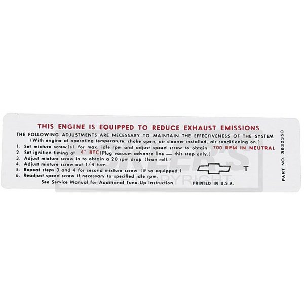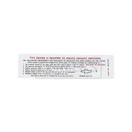 Reproduction Of Original Correct Show Ready Decal Good Condition Decal Required In Some States To Pass Emissions Testing Emissions Decals Can Vary, To Verify You Are Ordering The Proper Decal You Must Match The Emissions Code Located On The Corner Of Your Original. This Is A Reproduction Of Decal Code T Emissions decals can add the finishing touch to your El Camino restoration. Although not required until 1971, some earlier models were equipped with smog control. 1968 El Caminos sold in California and New York came factory with certain smog requirements including a visible emissions decal under the hood. We are proud to offer a superior reproduction of the factory emissions decal. Be sure to check your original, since these crisply printed decals are specially coded to your car. The El Camino Store offers a full line of emissions and underhood decals to help get your 1968 El Camino looking showroom new. Trust the El Camino Store for all your El Camino needs, from daily driver, show, or just to enjoy, we can get you there.