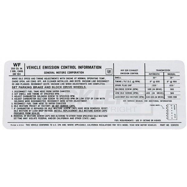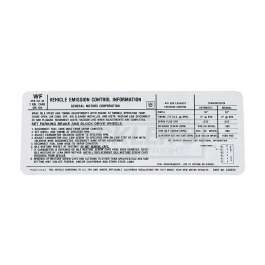 Reproduction Of Original Correct Show Ready Decal Good Condition Decal Required In Some States To Pass Emissions Testing Emissions Decals Can Vary, To Verify You Are Ordering The Proper Decal You Must Match The Emissions Code Located On The Corner Of Your Original. This Is A Reproduction Of Decal Code WF 1973 El Camino & GMC Sprints sold in California and New York came factory with certain smog requirements including a visible emissions decal under the hood. Many states now have adopted California and New York standards above Federal standards setting the bar that much higher requiring in many cases clear display of these labels and decals. All 1971 and newer El Caminos have emissions labels or decals showing that they were manufactured to meet either California or U.S. Federal standards. This 1973 WF El Camino emissions label or decal is affixed in the engine compartment or in a readily accessible location. At the top of this El Camino Emissions label are the words VEHICLE EMISSION CONTROL INFORMATION and the corporate name or trademark of the GM. If you live in an area that requires CARB (California Air Resources Board) or other Federal standards, make sure your emissions system meets requirements by checking with local rules and laws. The El Camino Store is proud to offer correct 1973 WF 350ci emissions labels to insure your El Camino, Super Sport, GMC Sprint, GMC SP, Estate or other variant looks its best and is legal to drive where you live. Remember, most states require your El Camino to possess emission standard equipment in order to pass smog and get registered. Trust the El Camino Store for all your El Camino needs, from daily driver, show, or just to enjoy, we can get you there.