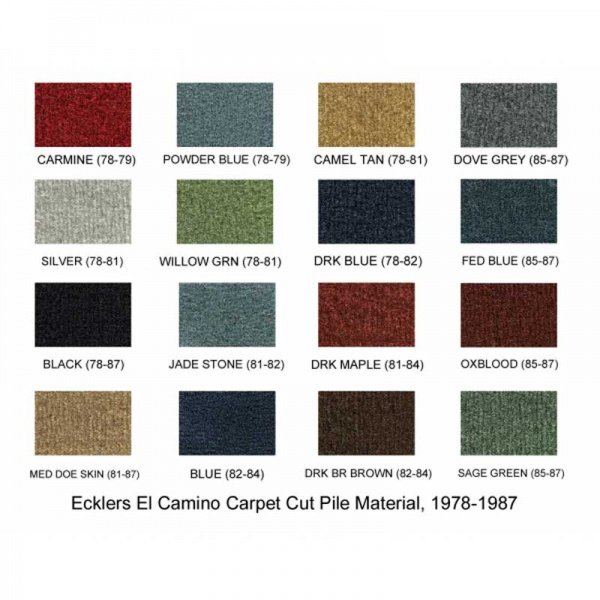 The El Camino Store has teamed with Auto Custom Carpet to bring you the highest quality reproduction carpet available. This durable Raylon-Nylon blend cut pile carpet has the factory correct appearance and is more durable than anything previously available. Original 1978-1981 El Camino carpet and earlier reproductions would color fade badly after only a few years or a few car shows with the top down. Our Raylon-Nylon blend is much more color fast than the other carpet sets previously available. Also, original carpet was prone to "Fuzz-up" so you have little balls of fine fuzz everywhere on the carpet. New manufacturing techniques and materials give this carpet from ACC unmatched durability. Installing a new carpet set from The El Camino Store will ensure you the original look want and the quality you demand for your 1978, 1979, 1980 and 1981 El Camino restoration. Kit Contains Passenger Area, Rear Curtain, Storage Area And Door Panel Carpet