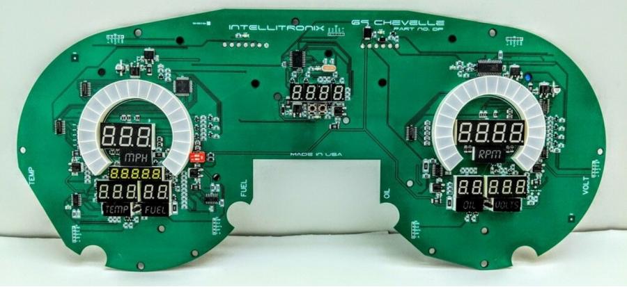 Add panache to your 1969 Chevelle with this 1969 Chevelle LED Digital Replacement Gauge Panel by Intellitronix and make all your friends envious. The 69 Chevelle dash features 2 direct fit printed circuit boards, 2 custom fit "smoked" plexiglass face plates, universal temperature, oil pressure, and speedometer sending units with sender and sensor for vehicles without electronic transmission or cruise control. Mounting hardware and instructions for installation are included.