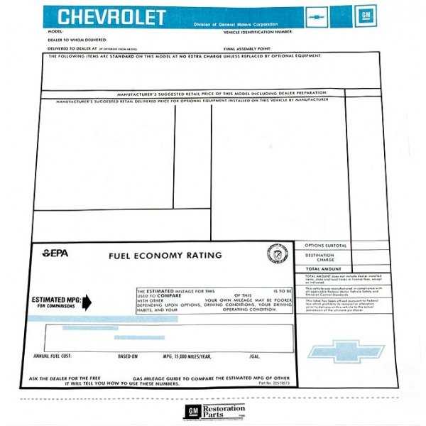 Reproduction Of Original Official Window Sticker As Found On Your El Camino When New Commonly Affixed To Door Glass Usually Destroyed Or Discard After Car Was Sold Great For Show Cars Blank Form Ready For Your Data This El Camino reproduction window sticker has been manufactured to original factory specifications using today's modern manufacturing techniques. You will find the fit, finish and function will work superbly for your restoration. In addition, using a reproduction window sticker from the El Camino Store will add authenticity and value to your vehicle.