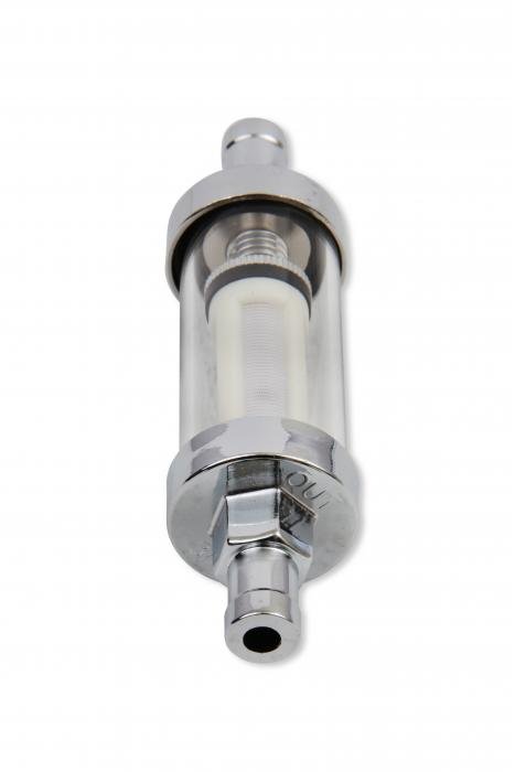 The in-line Clearview fuel filter has chrome ends and a glass body for clear and quick viewing of fuel flow and debris trapped in the 100 micron white mesh replaceable filter element. Supports up to 400 horsepower, fits 3/8 inch fuel hose only.
