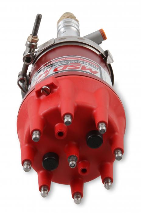 The increased out put of the 20 Amp pro-mag was born of racers being racers; always asking for more power. This stemmed from drag racers that were using a 12 Amp system, but just didn't require a 44 Amp system. The engineers at MSD found that with a few changes to the internals of the generator it would deliver the increased current through the same electronic points box, PN 8106. The 20 Amp magneto is a favorite in alcohol slurping engines such sportsman drafters and quick-8 racers. There are three different generators available; a band clamp design in both CW and CCW rotation, plus a model built on a Chevy distributor base. All three require the PN 8106 electronic points box. The band clamp versions are equipped with a large Ford style cap while the Chevy version uses a 4 In. cap and both are topped with heavy duty retainers.