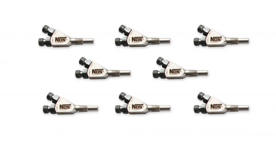 8-Pack Annular Discharge Fogger Nozzle (Stainless Steel) - NOS has done it again! The stainless steel Annular Discharge nozzle is the most effective design in the world, The Annular Discharge Fogger® nozzle's secret lies in specially engineered annular orifices which mix the nitrous and fuel in a radial pattern outside the nozzle tip to provide superior atomization of supplemental fuel as well as more even fuel distribution within the nitrous flow. This new nozzle design produces an even tighter "cone" of nitrous oxide/fuel mixture and provides more precise control of nitrous/fuel ratios throughout the jetting spectrum. It is important to note that the Annular Discharge nozzle shoots out straight, and as such is NOT a direct replacement for the standard Fogger™ or Fogger® 2 nozzles. It is designed to be fitted to the manifold at a very tight angle (much closer to 30° than the normal 90° -but entirely dependent on runner design). Because of the way the Annular Discharge nozzle can be installed, it does not protrude into the intake tract and disrupt flow. The nozzles are made of stainless steel for superior durability.