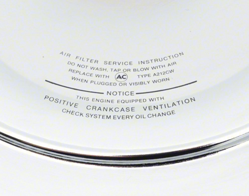 Features include "Air Filter Service Instruction" information imprinted in black on the underside of the chrome lid, in the authentic curved pattern as original. Correct printing and fonts are used to ensure complete accuracy and originality.