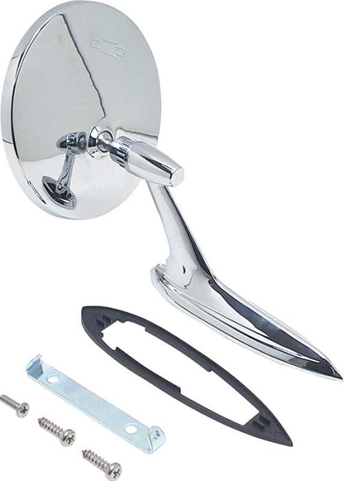 Reproduction of the original style outer door rear view mirror with Bow Tie Logo featuring convex glass. The convex glass helps eliminate the passenger side blind spot. Each rear view mirror features the correct ribbed base and comes with a beautiful chrome finish as original. Includes mirror, bracket, gasket and mounting screws for a complete installation. For use with RH passenger side, but will also fit drivers door. Note: For use with 1963 Corvette 1st design (early production).