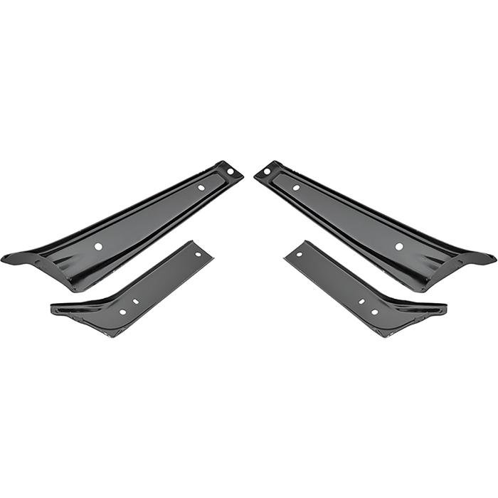 Reproduction front bumper bracket set for 1964 Chevrolet Chevelle, Malibu, and El Camino models. Manufactured in stamped steel to factory specifications, each bracket replicates the original design for proper fit, strength, and OE appearance. This 4-piece set includes the correct LH and RH inner and outer brackets required to properly mount the front bumper to the frame. Finished in black EDP coating for rust and corrosion resistance.