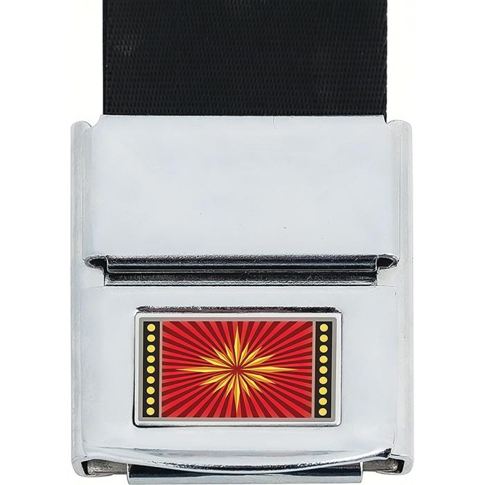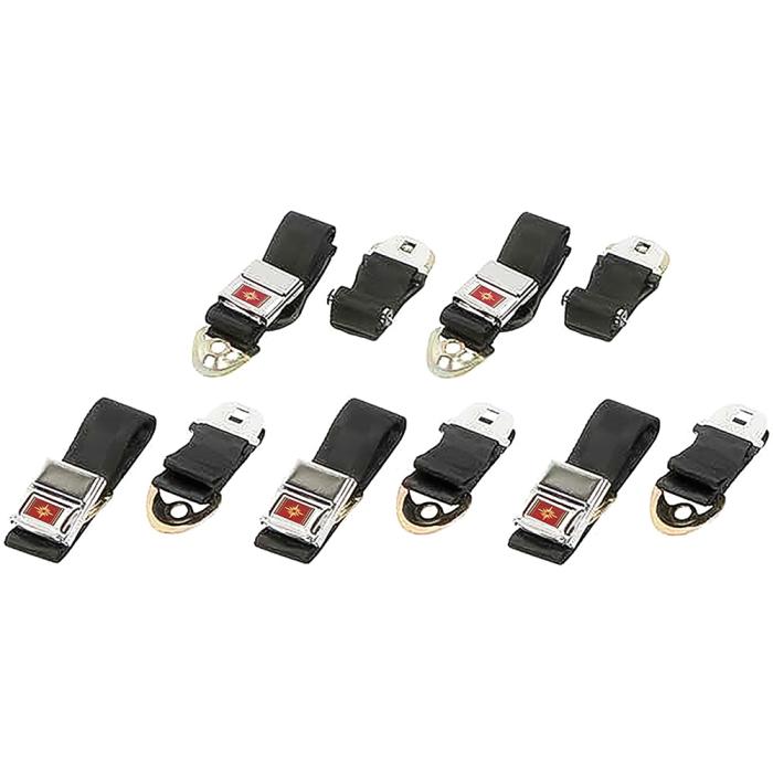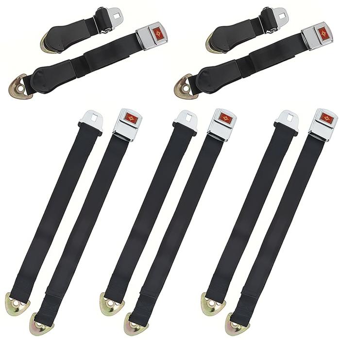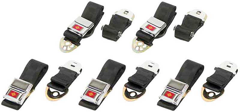 Reproduction of the original seat belts set designed for use with 1965-66 Chevrolet Impala, Bel Air, Biscayne, Caprice, Chevy II, Nova, and Chevelle models. Each seat belt set replicates the original in belt design offering an original and authentic appearance. Features the correct length webbing and original style stitching matching the original GM belt. This seat belt set will replace the original worn out belt set, or can be added to most passenger car models. Emblazoned with OER's exclusive and unique Gold and Red "Starburst" decals. Each decal comes in a color scheme that is reminiscent of the original featuring the "Starburst" logo in gold, on a red background with goldleaf design and chrome borders. Fits front bucket seats (RH and LH), and rear seat (RH, center, LH). Seat belt webbing and stitching comes in black. This five belt set includes 2 front and 3 rear seat belt assemblies.