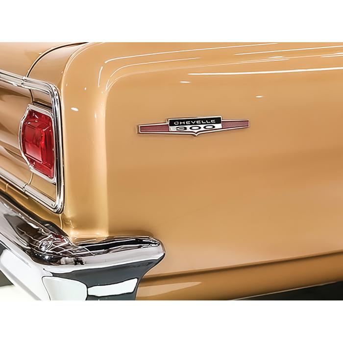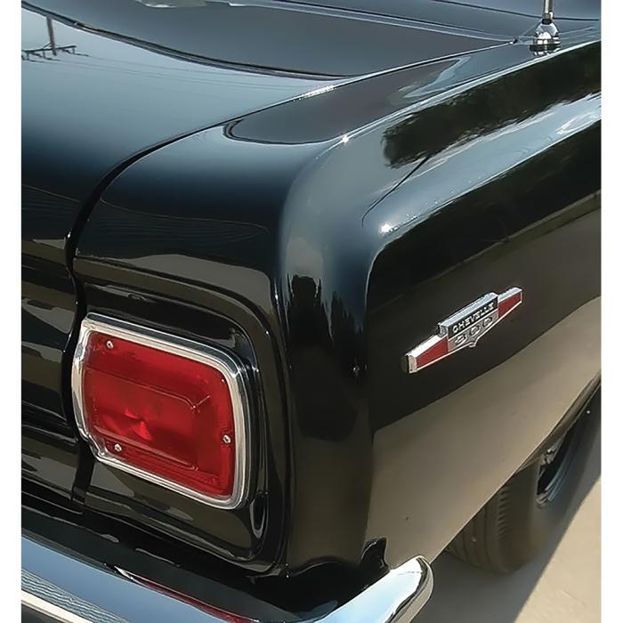 Reproduction Chevelle 300 nameplate emblem for the quarter panel on 1965 models. This emblem fits on left or right side on the upper rear portion of the rear quarter panel. Die-cast zinc emblem is chrome plated and backfilled in black and red enamel, as original. Replaces GM # 4485512. Fits: 1965 Chevelle 300 models. Sold individually. Two emblems are required per vehicle.