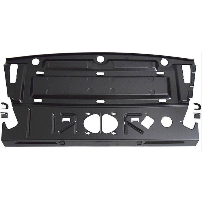 Reproduction package tray panel for 1966-67 Chevelle and Malibu 2-door hardtop models. Manufactured from quality stamped steel to factory specifications, this panel is located beneath the rear window and forms the base for the rear package tray. Designed to restore original fit, structure, and appearance, while providing mounting provisions for optional accessories. Features correct factory-style contours and details for OE authenticity. Finished in black EDP coating for rust and corrosion resistance.