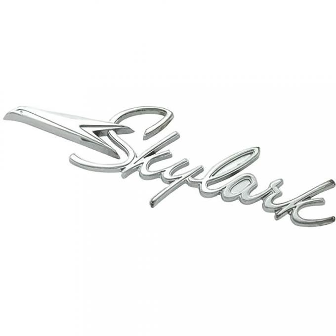 Reproduction Skylark script emblem for the instrument panel on 1966 models. Die-cast zinc emblem is chrome plated, and highly polished fo a bright finish. Installs on the RH, passenger side of the dash above the glovebox door. Replaces GM # 1376304 Fits: 1966 Skylark models.