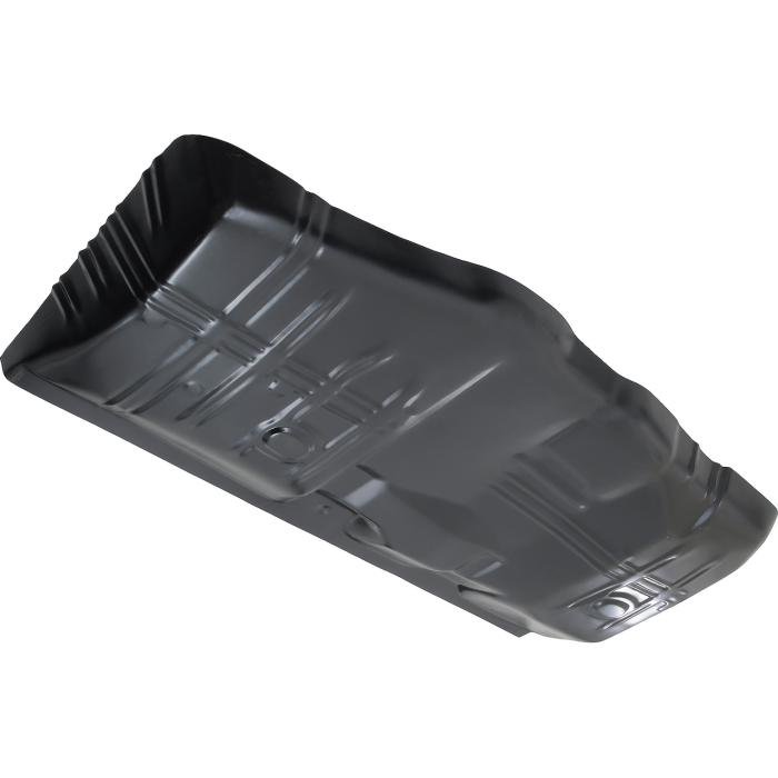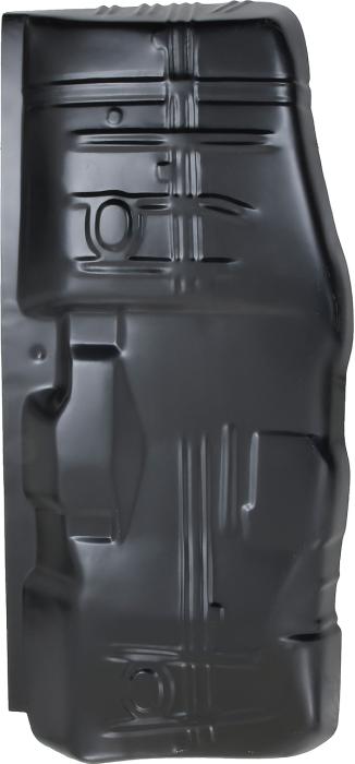 Reproduction RH floor panel for 1968-72 Chevelle and other GM A-Body models. Each floor panel is manufactured in stamped steel to factory specifications featuring correct contours for an authentic appearance and fit. Extends from the rear seat section to the firewall extension. This floor pan features additional metal which extends upward near the transmission tunnel allowing more coverage than other floor pans currently on the market. Black EDP coated for rust and corrosion prevention. RH, passenger side of the vehicle.