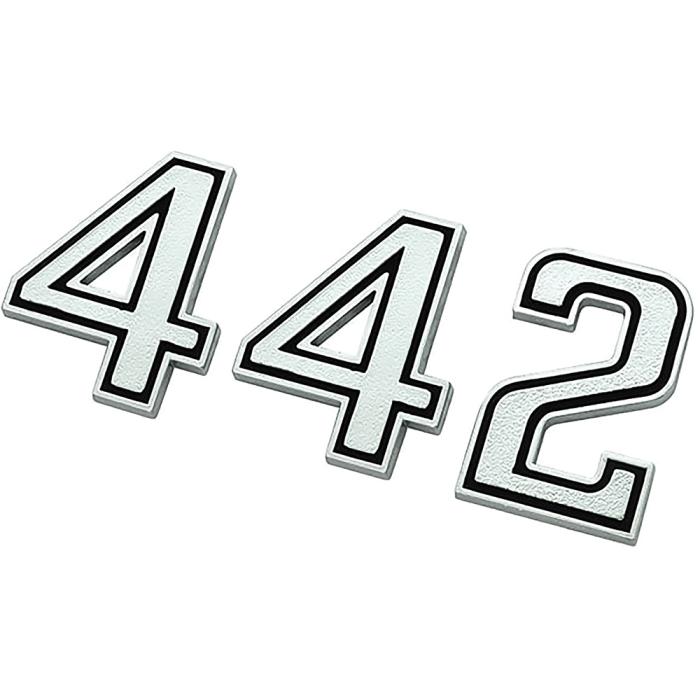 Reproduction trunk/decklid emblem set for 1969-72 Cutlass and 1969-71 442 models. These emblems are a three piece set of individual numbers and are chrome with inlaid black pinstriped outline. Sold as a set.