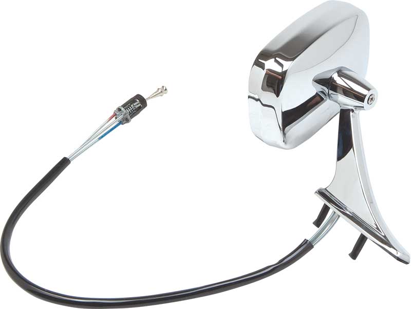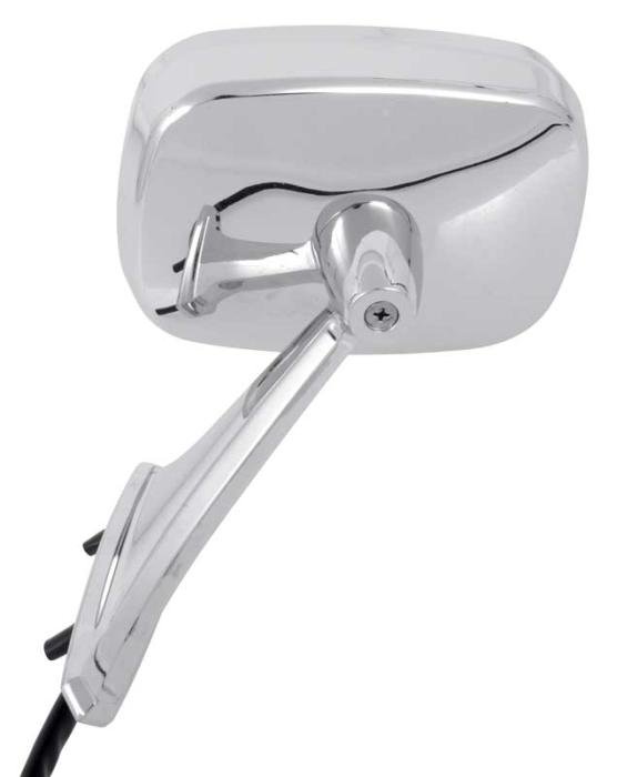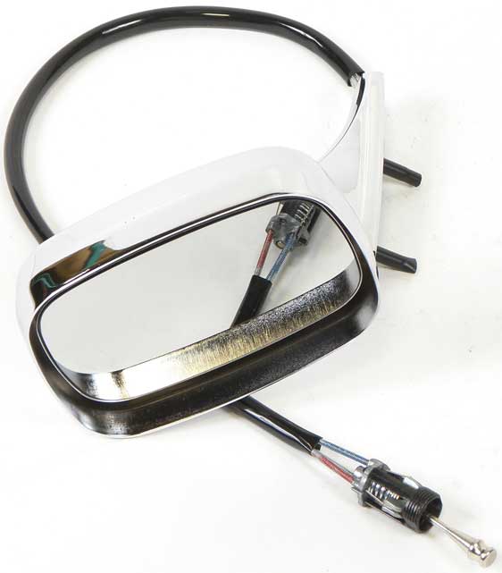 Reproduction of the original outer door remote mirror assembly designed for use with 1969 Pontiac Firebird models. Each mirror is manufactured in die-cast zinc and chrome plated matching the original design, appearance, and fitment. This mirror comes complete with the outer door mirror, mirror cable, mounting bracket, and interior chrome knob. Attaches with two mounting studs as original. For use on LH drivers door. Note: Mirror gasket and interior knob escutcheon available separately.