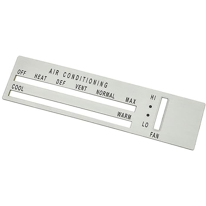 Aluminum panel for air conditioning insert that has silk screened black lettering and die stamped brushed aluminum. Upgrade the peeling, faded or damaged A/C insert with this great reproduction. This item has an adhesive backing and fits 1970-72 Oldsmobile Cutlass and 1970-71 Oldsmobile 442 models. For applications with A/C and without defogger. Sold individually.