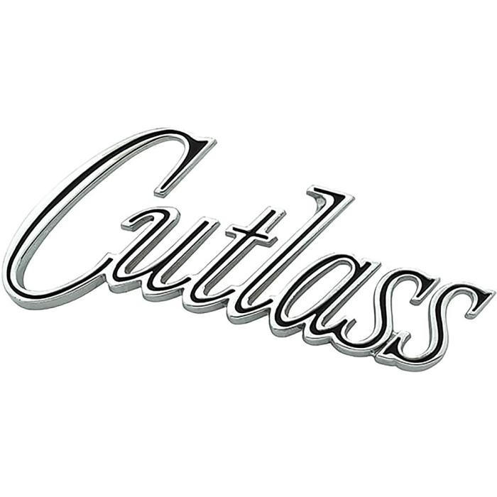 Reproduction Cutlass script lettering fender emblem for 1970 Cutlass. These emblems are chrome with inlaid black trim highlights. Sold individually.