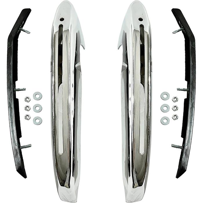 Reproduction front bumper guards for 1971-72 Chevrolet Chevelle and El Camino models. Each guard is manufactured in stamped steel and finished in high-quality chrome plating with the correct rubber insert for OE authenticity. Designed to replicate the original factory components, these bumper guards provide added protection while maintaining an authentic appearance. Includes both LH (driver side) and RH (passenger side) bumper guards.