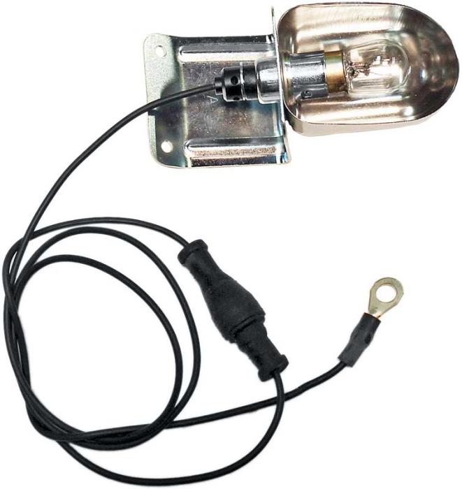 Reproduction under hood light assembly for various GM models including Chevy, GMC pickup, Blazer, Jimmy, Suburban, 1972-74 Camaro, Chevelle, El Camino, Impale, Bel Air, Biscayne, Caprice, Monte Carlo, and Nova models. Each lamp assembly is manufactured to correct factory specifications using GM schematic drawings to ensure an authentic and functional replacement of or addition to the vehicle. Includes correct color wiring, connectors, lamp bezel, bulb, and terminal ends.