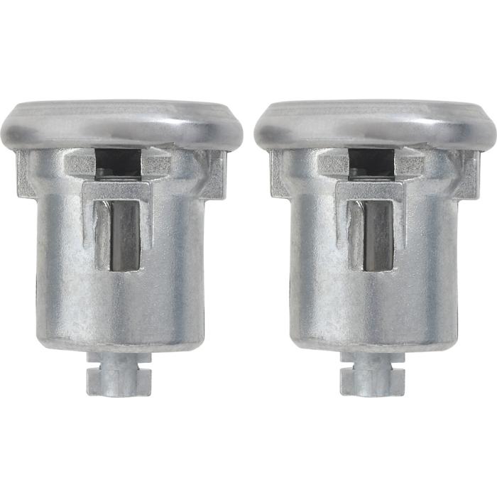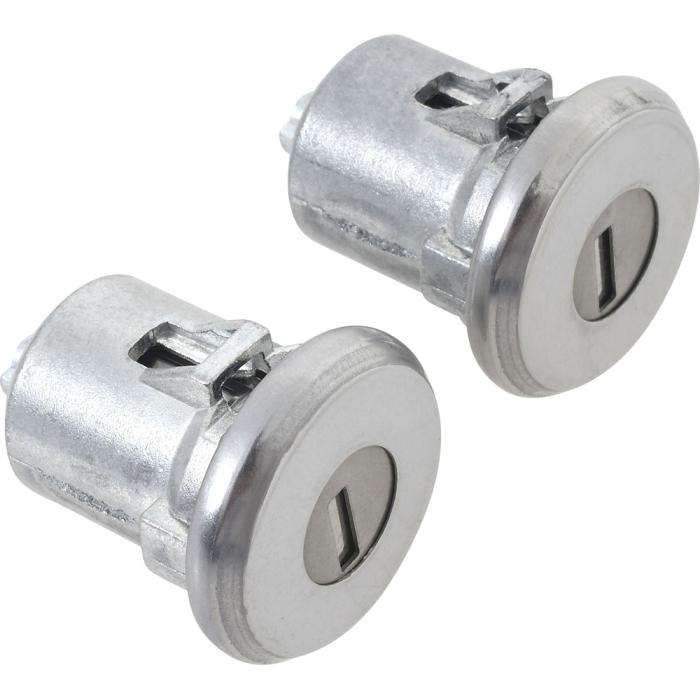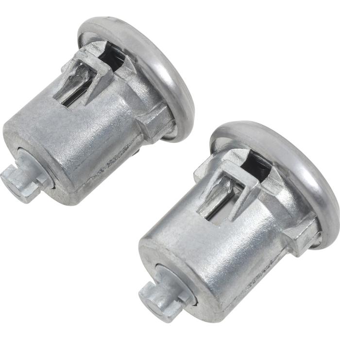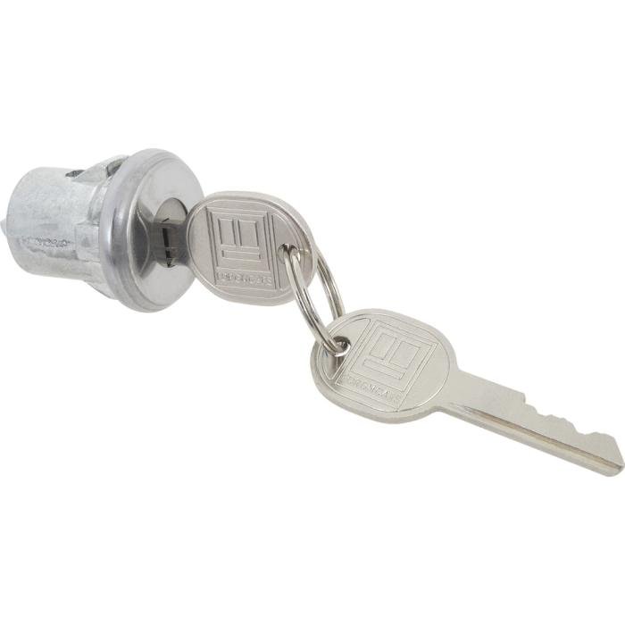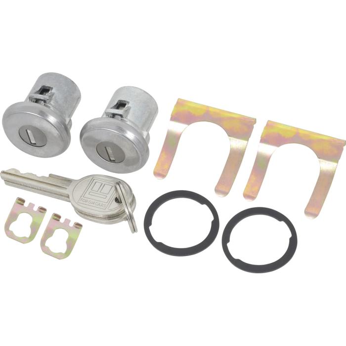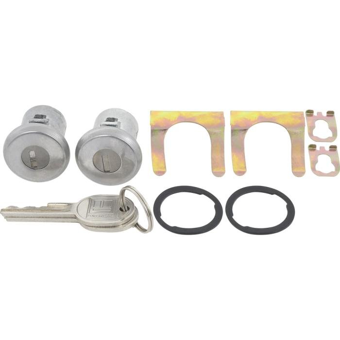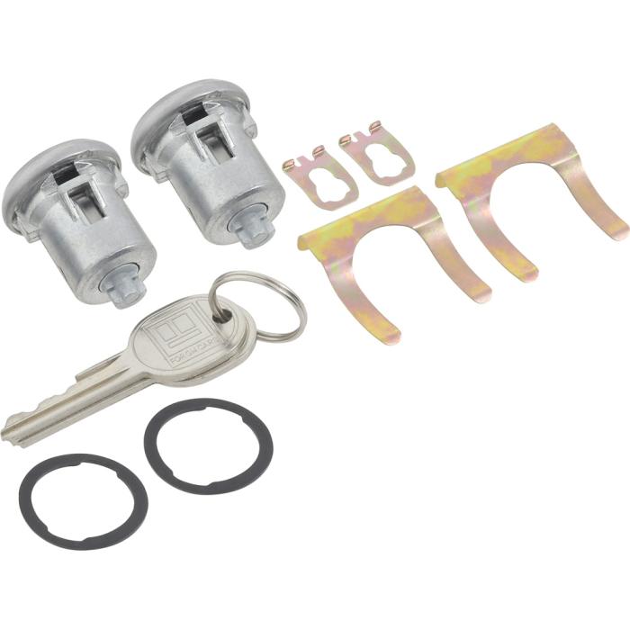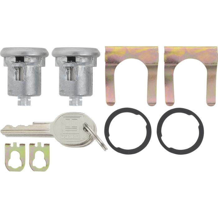 Reproduction door lock cylinders for various 1961-87 Buick, Cadillac, Chevrolet, Pontiac, and Oldsmobile models as listed. Includes two door lock cylinders with bright finish face finish, two generic logo keys, cylinder retainers, and gaskets for a complete replacement. NOTE: Check lock pawl shaft length on your original door lock before ordering, this lock features the short style shaft.
