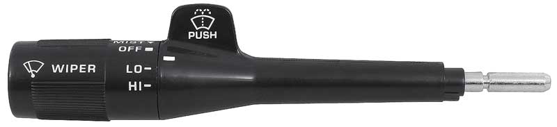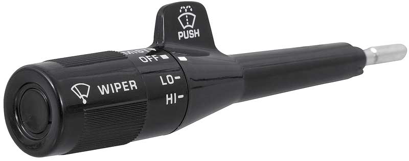 Reproduction turn signal lever for a variety of GM models including 1987-89 Camaro models without pulse wipers. Features a black stalk and black knob.