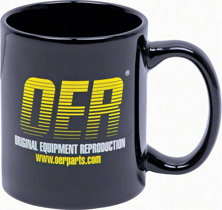 This classically styled acrylic mug has the look of fine ceramic but is actually made of thick, durable, chip resistant plastic and features the OER® logo in bright yellow with words "Original Equipment Reproduction".