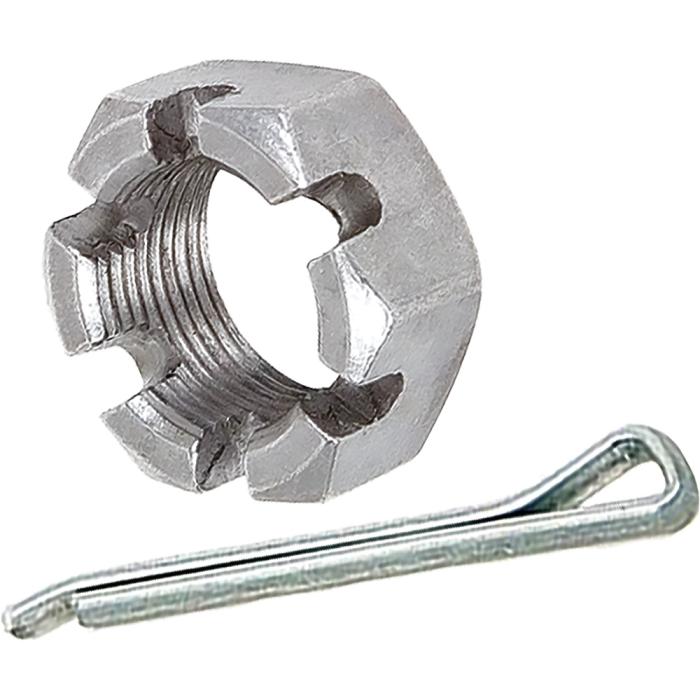 3/4"-20 With 1-1/16" hex head spindle nut and plated 1/8" x 1-1/2" cotter pin for securing drum or rotor to spindle. Kit contains one nut and one cotter pin. 2 kits required per vehicle.