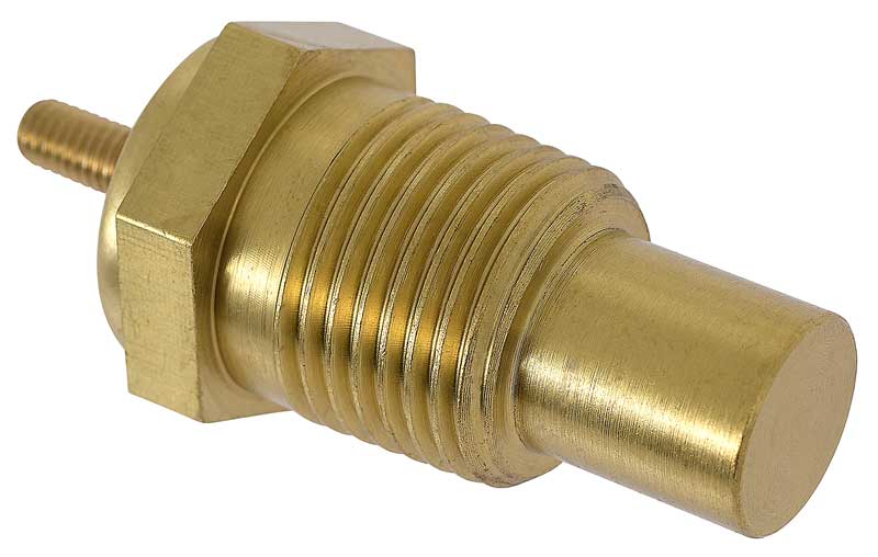 The temperature sending unit screws into the side of the cylinder block or on the intake manifold and allows the temperature gauge to function properly. This OER® Authorized reproduction is produced using the correct bullet-style terminal end with the correct housing and resistance for accurate temperature gauge reading. 1/2 x 14 N.P.T.F. external thread.