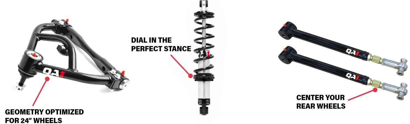 QA1’s high clearance front sway bar is 4” narrower than OEM bars, providing full turning radius on 24” wheels. It was also designed to work with OEM or notched front frame rails. Rear anti-roll bars reduce unwanted body roll and improved 60-foot times.