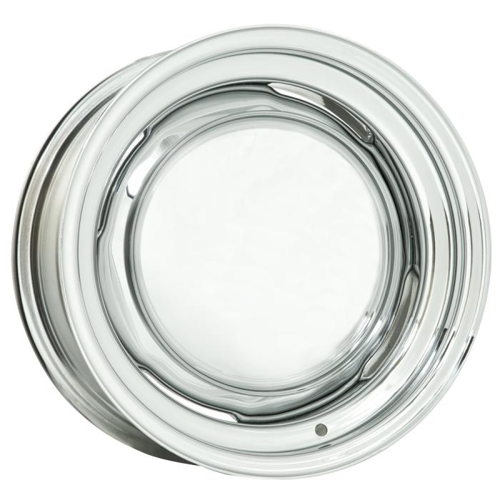 The 64 Series O.E. Chevy-Ford wheel in brilliant show chrome is a versatile wheel available in sizes from 14-17". The 64 Series wheel fits 10 1/8" outside knob caps and will accept Ford & GM factory "dog dish" style caps.